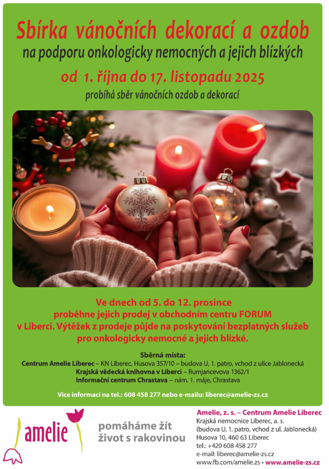 Máte doma vánoční ozdoby, které už nevyužíváte? Dejte jim šanci znovu rozsvítit Vánoce v jiných domovech a zároveň pomoci lidem v těžké životní situaci. Centrum Amelie Liberec vyhlašuje tradiční sbírku vánočních ozdob a dekorací, která potrvá od 1. října do 17. listopadu 2025.