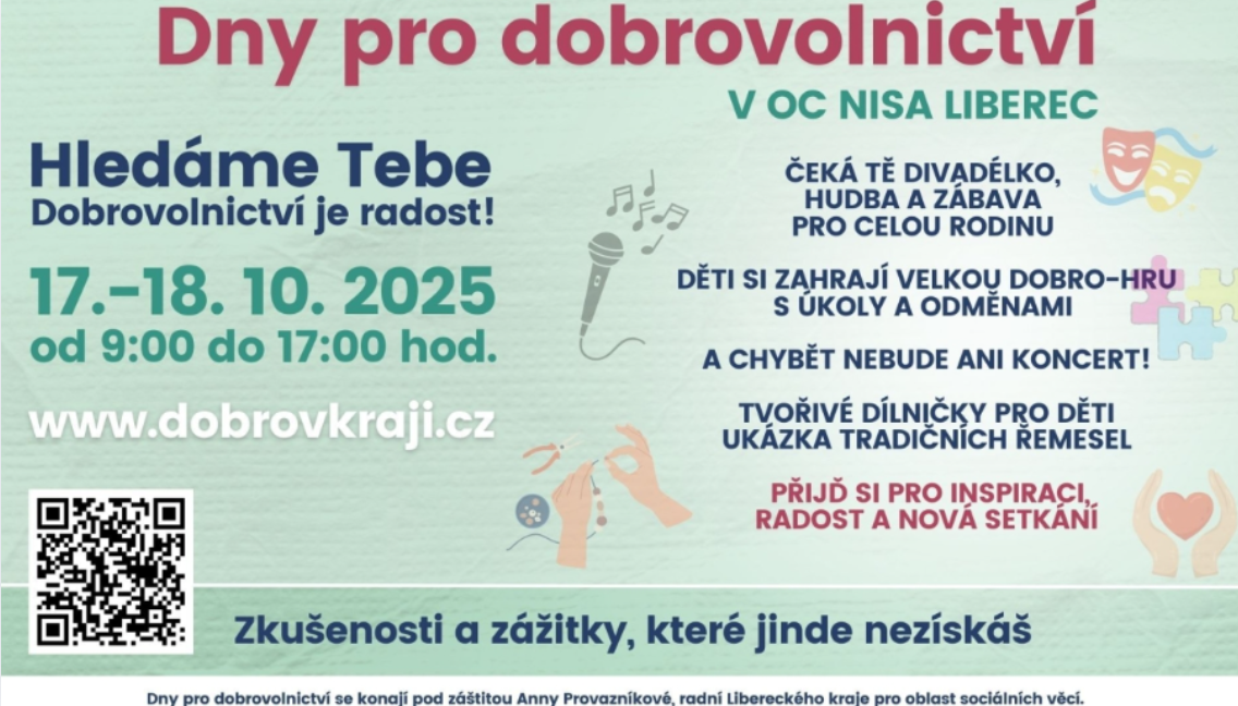 Inspirace, zábava i setkání s lidmi, kteří pomáhají. To vše nabídnou letošní Dny dobrovolnictví v Libereckém kraji. Regionální dobrovolnické centrum Libereckého kraje je pořádá ve dnech 17. a 18. října 2025 v OC Nisa Liberec. Letošní podtitul zní „Dny pro dobrovolnictví – Hledáme Tebe!“.