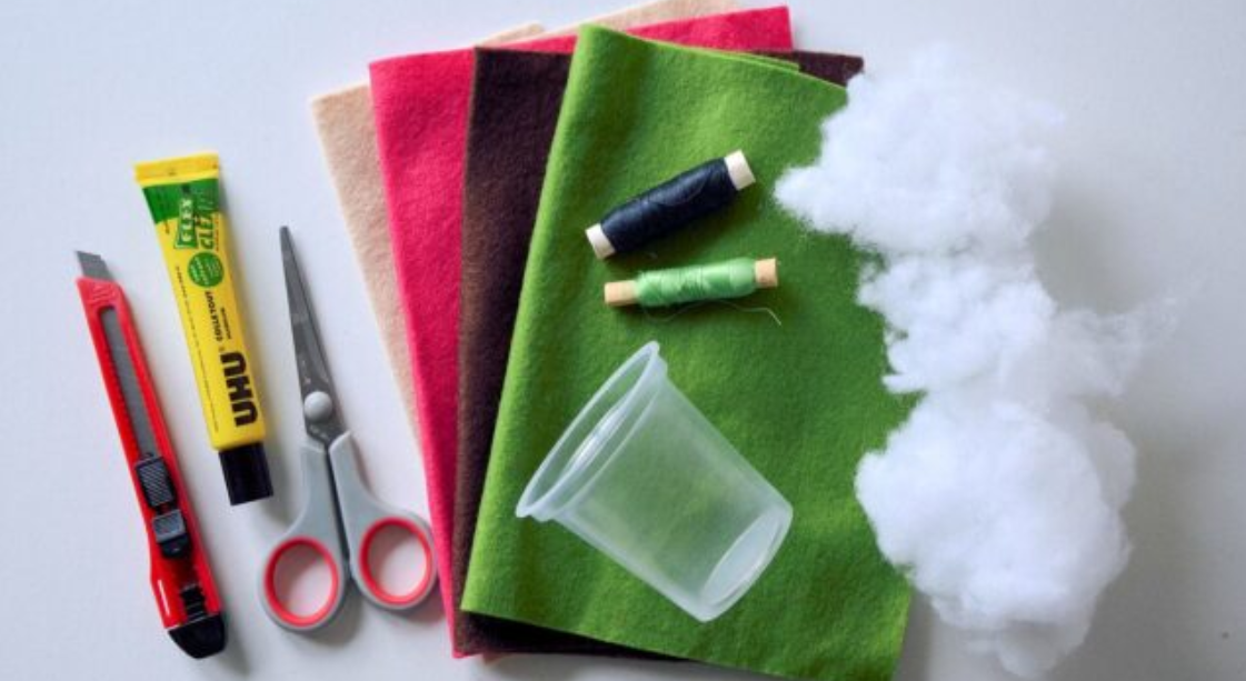 Na výrobu kaktusového jehelníčku si připravíme plsť v různých odstínech (k sehnání je ve výtvarných potřebách nebo online), nůžky, jehlu a nitě v odpovídajících barvách. Hodit se bude také plastový kelímek (například od jogurtu), řezák, syntetické rouno nebo vata a případně univerzální lepidlo.