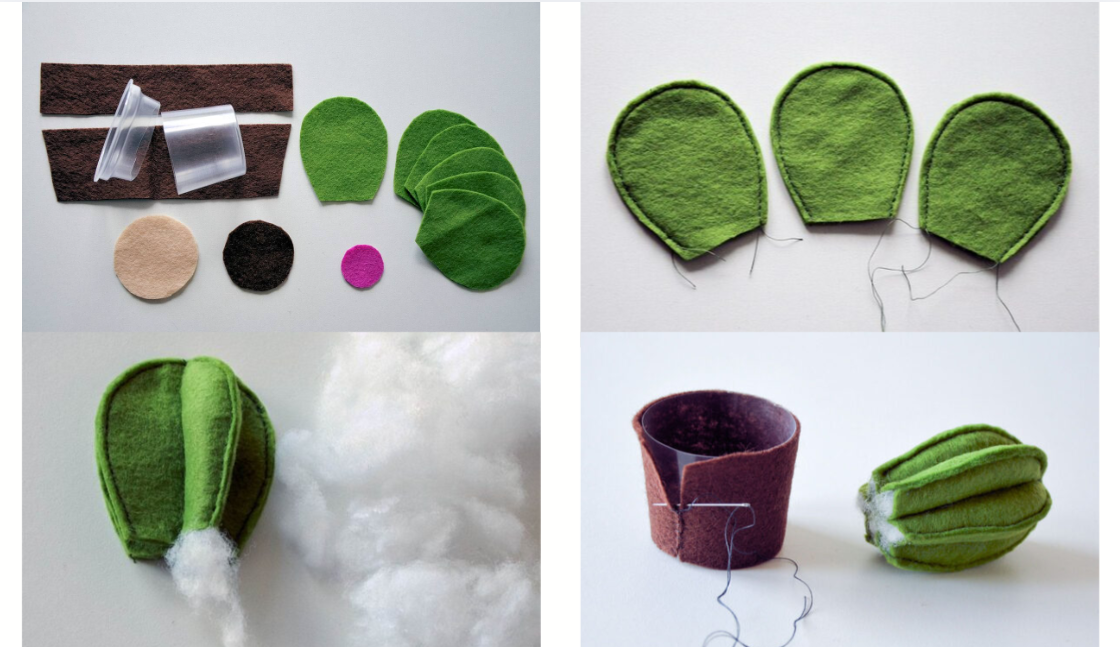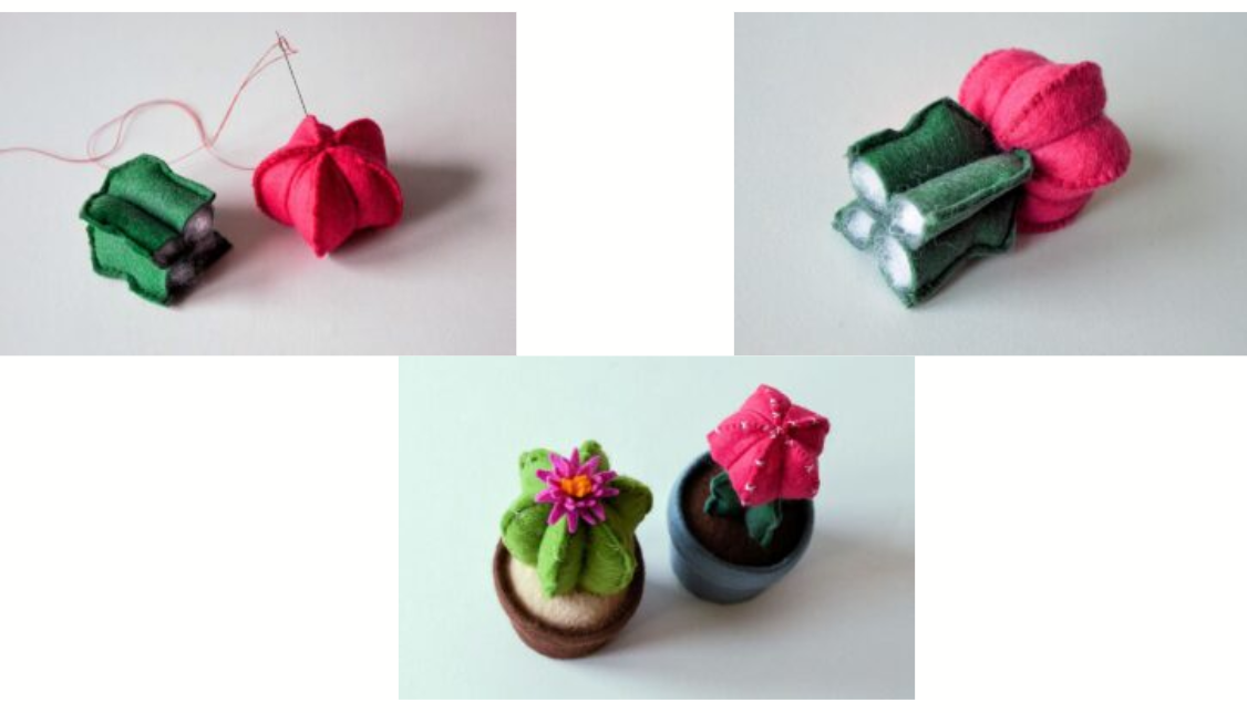Ke spodní části kaktusu přišijeme skrytým stehem kruh ze světlejší plsti (zeminu). Kelímek vyplníme rounem a kaktus s „deklíkem“ pevně přišijeme ke květináči, aby stabilně držel.