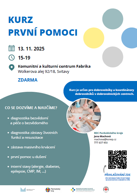 Regionální dobrovolnické centrum Pardubického kraje, které provozuje Koalice nevládek Pardubicka, chystá ve spolupráci s Českým červeným křížem a za podpory Pardubického kraje a Ministerstva vnitra ČR pokračování série bezplatných kurzů první pomoci pro dobrovolníky a jejich koordinátory z dobrovolnických center.