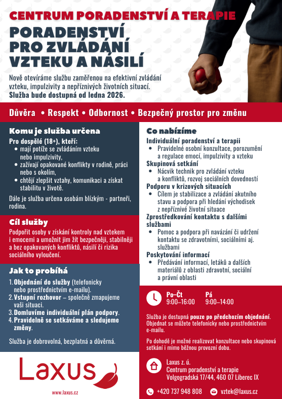 Od 1. ledna 2026 rozšířilo Centrum poradenství a terapie organizace Laxus z.ú. svou nabídku o službu zaměřenou na efektivní zvládání vzteku, impulzivity a nepříznivých životních situací. Služba je určena dospělým osobám, které chtějí pracovat na regulaci svých emocí a zlepšení vztahů, a také jejich blízkým. Vznik služby podpořil Liberecký kraj.