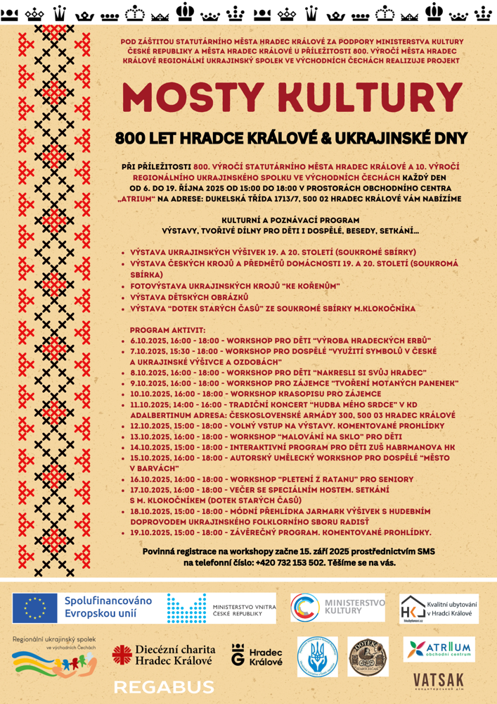 Letošní Dny ukrajinské kultury v krajském městě propojí hned dvě výročí - 800 let Hradce Králové a 10 let Regionálního ukrajinského spolku ve východních Čechách. Návštěvníci se mohou těšit na výstavy, besedy, koncert a kreativní workshopy pro děti, dospělé i seniory od 6. až do 19. října 2025. Ukrajinské a české výšivky a kroje, domácí předměty, dětské obrázky a také exponáty z výstavy „Doteky starých časů“ pana Michala Klokočníka a dalších soukromých sbírek, to vše bude k vidění v prostorách OC Atrium v Hradci Králové. Akci pořádá Regionální ukrajinský spolek ve východních Čechách a Integrační centrum pro cizince hradecké Diecézní charity pod záštitou Statutárního města Hradec Králové za podpory Ministerstva kultury ČR a města.