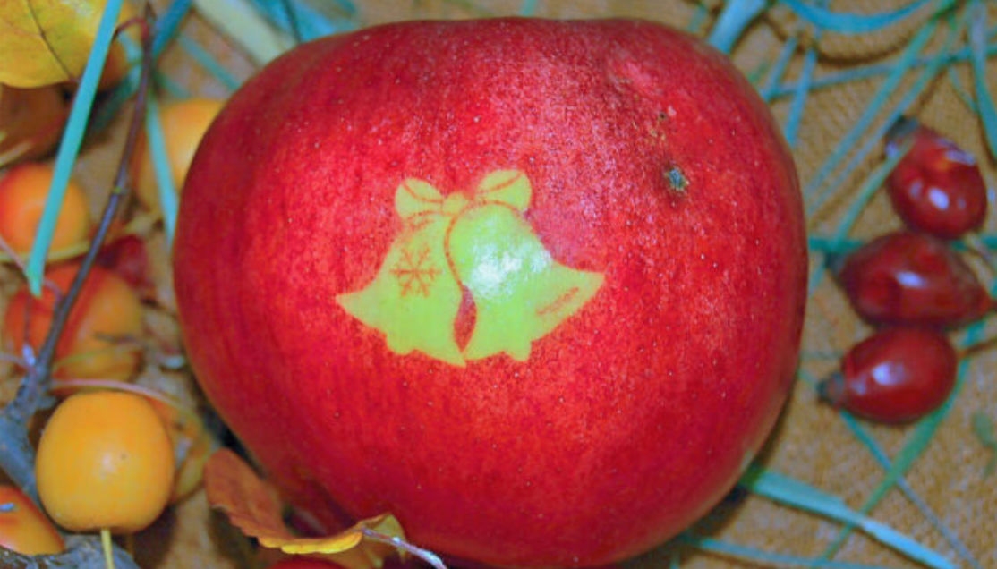 - Pro maskovací šablonu najdeme takový samolepicí materiál, který na jablku vydrží i přes déšť, a současně půjde sloupnout, aniž bychom ovoce poškodili.