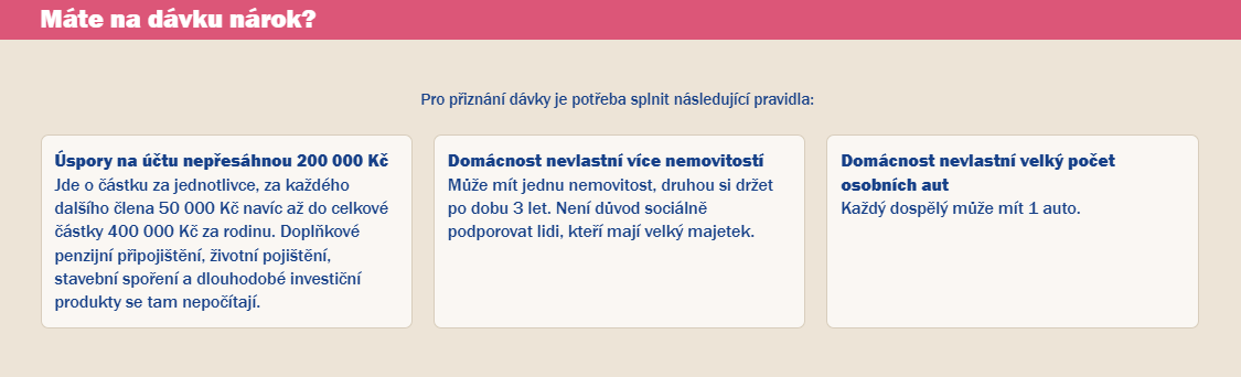 Bez vašeho vědomí se nic dít nebude. Součástí žádosti o dávku je i souhlas s majetkovým testem. Chceme od lidí, kteří žádají peníze od státu, aby prokázali, že před námi neskrývají hodně peněz a třeba tři byty nebo pět aut. Pomoc má jít jenom těm, kteří ji opravdu potřebují.