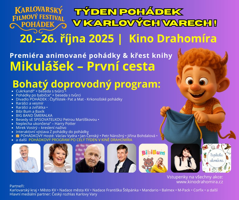 Ve dnech 20. 10. - 26. 10. 2025 se Karlovy Vary promění v pohádkové město plné fantazie, úsměvů a nezapomenutelných příběhů. Představte si místo, kde se na pár dní všechno promění v říši pohádek. Připravte se na kouzelný týden, kdy se můžete těšit na: