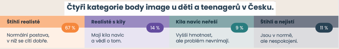 - Štíhlí realisté: Děti s přiměřenou hmotností, které se cítí dobře ve svém těle (67 %).